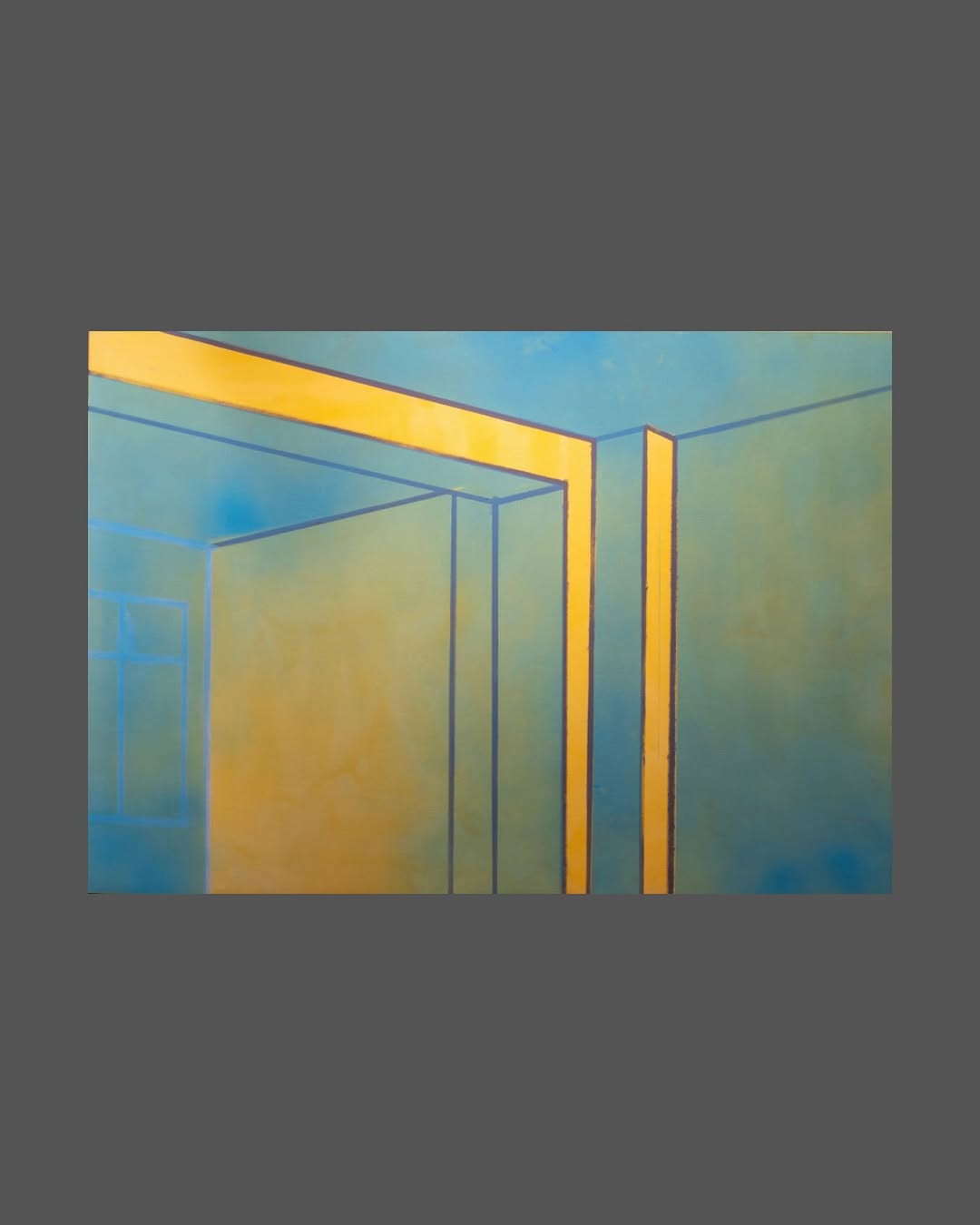 Bu eser, mekânın sınırlarını renk ve çizgiyle yeniden tanımlar. sarı tonlar, yapısal unsurların ışıkla temasını vurgularken, mavi zemin derinlik ve sessizlik hissi yaratır. sanatçı, mimari bir alanın geometrisini soyut bir düzleme taşır; böylece izleyiciye hem içeri hem dışarı bakma duygusu verir. sade fakat yoğun bu kompozisyon, boşluk ve yapı arasındaki dengeyi sessizce sorgular