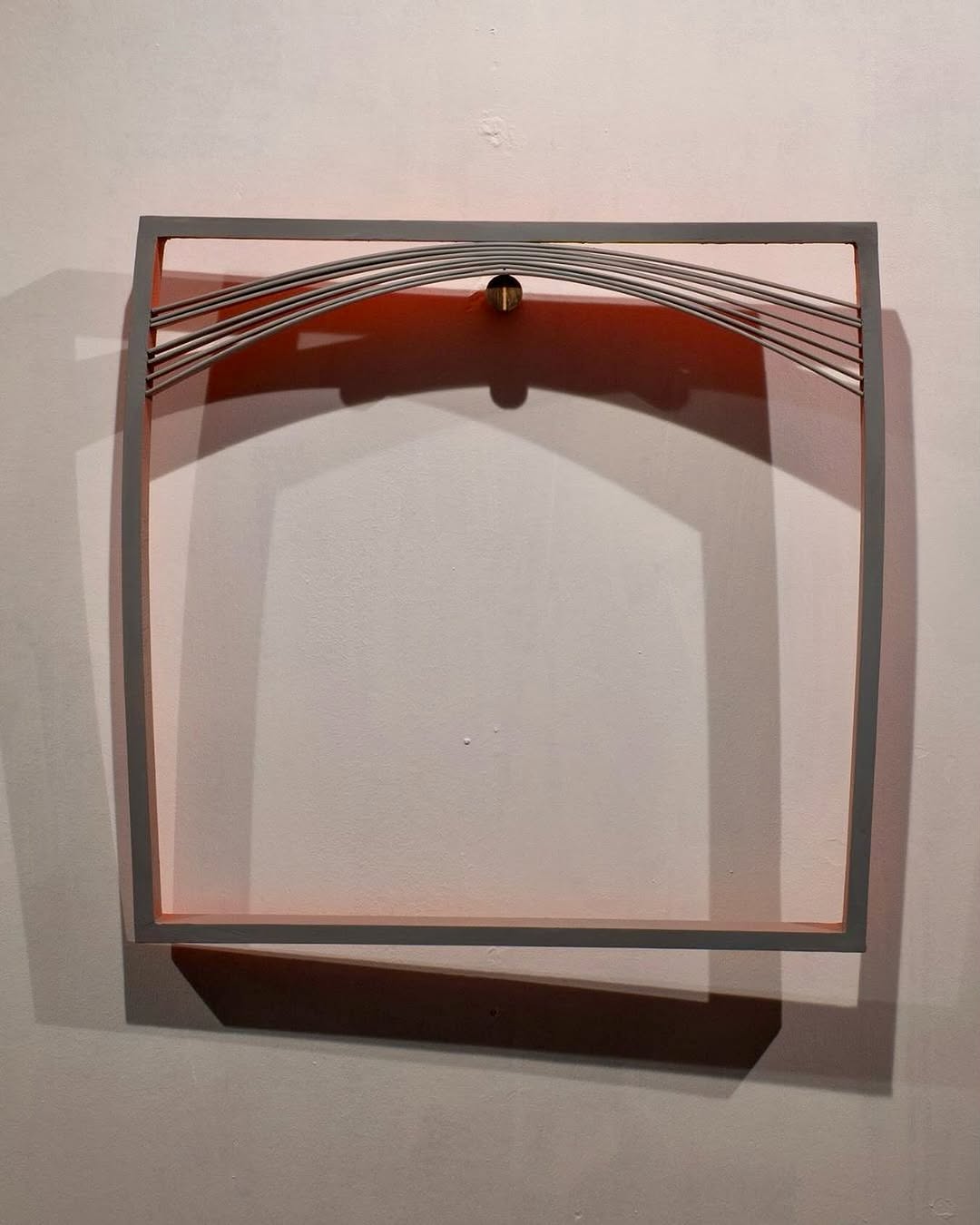 Bu eser, boşluk ve denge kavramları üzerine minimalist bir araştırmadır. Metal çerçeve, içinde yer alan ince çizgilerle hem fiziksel hem de görsel bir gerilim yaratır. Ortadaki eğrisel form, gerilimin en yüksek noktasını temsil ederken, gölge oyunu eserin algısını sürekli değiştirir. Işık ve form arasındaki bu diyalog, izleyiciyi mekânın sessizliğinde düşünmeye davet eder