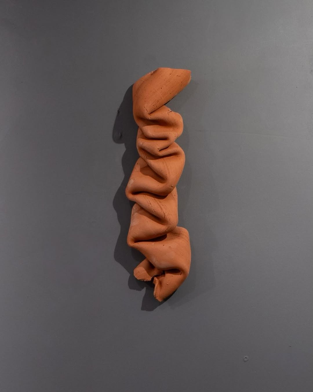 Bu eser, malzemenin doğal yapısına dokunmadan, biçimsel müdahalenin sınırlarını araştırır. sanatçı, toprağın kendi ağırlığı ve esnekliğiyle oluşturduğu kıvrımları, zamanın ve hareketin izleri olarak sunar. sıkışmış form, hem içsel bir gerilimi hem de dönüşümün sessizliğini yansıtır. yüzeydeki kırışıklıklar ve gölgeler, doğanın rastlantısal estetiğini görünür kılar. bu sade fakat güçlü ifade, izleyiciyi madde ile duygu arasındaki ilişkiyi yeniden düşünmeye davet eder.