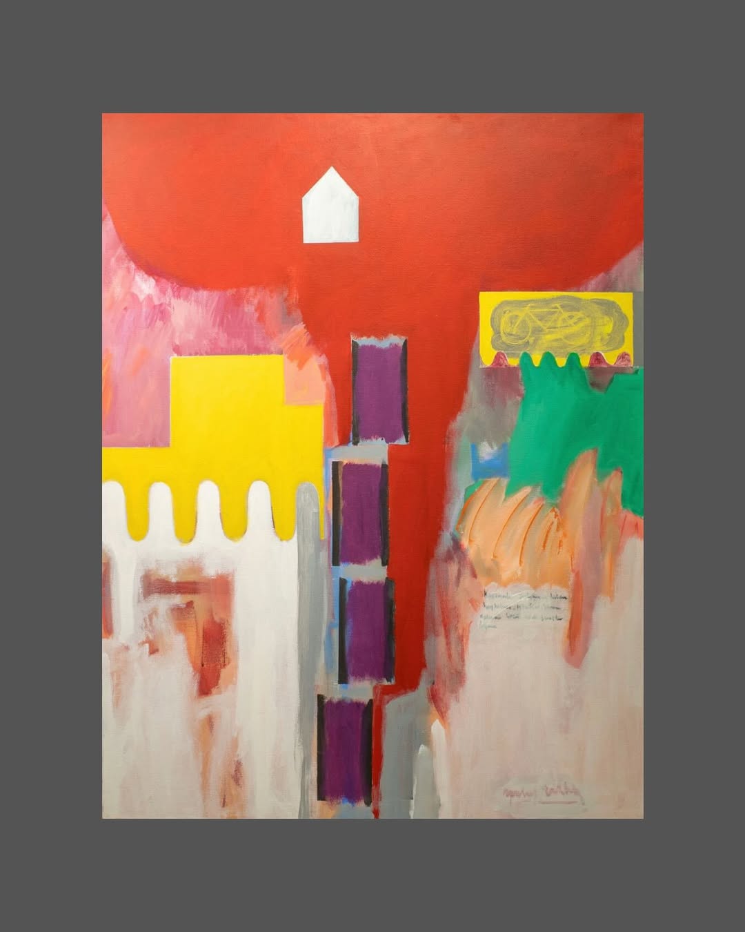 Bu eser, renklerin ve biçimlerin sade ama güçlü ilişkileri üzerine kuruludur. kırmızı alan, merkeze yerleşerek hem duygusal hem mekânsal bir derinlik yaratır. geometrik formlar, sarı, mor ve yeşil tonlarıyla birbirine karşıt ama dengeli bir yapı kurar. beyaz ev biçimi, aidiyet ve varoluş hissini simgelerken, çevresindeki soyut lekeler zamanın ve bellek katmanlarının izlerini taşır. sanatçı, sıcak ve soğuk renklerin karşılaşmasında, içsel bir denge arayışını görsel bir şiire dönüştürür